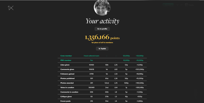 We have greatly redesigned the top lists and created a whole new activity feature where you can see detailed statistics of all your activities on 1x, including levels (0-100) for each category.